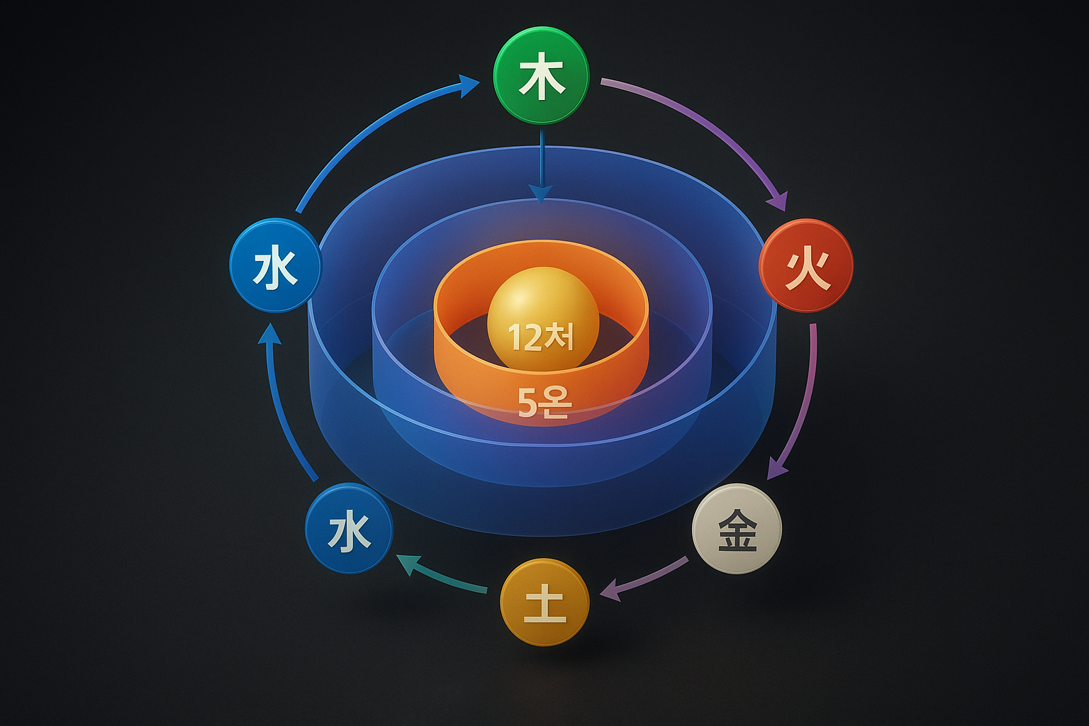 12연기 = 존재의 흐름(用)그리고 이 전체는 **오행(五行: 木火土金水)**이라는 운행 원리로 통합됨.