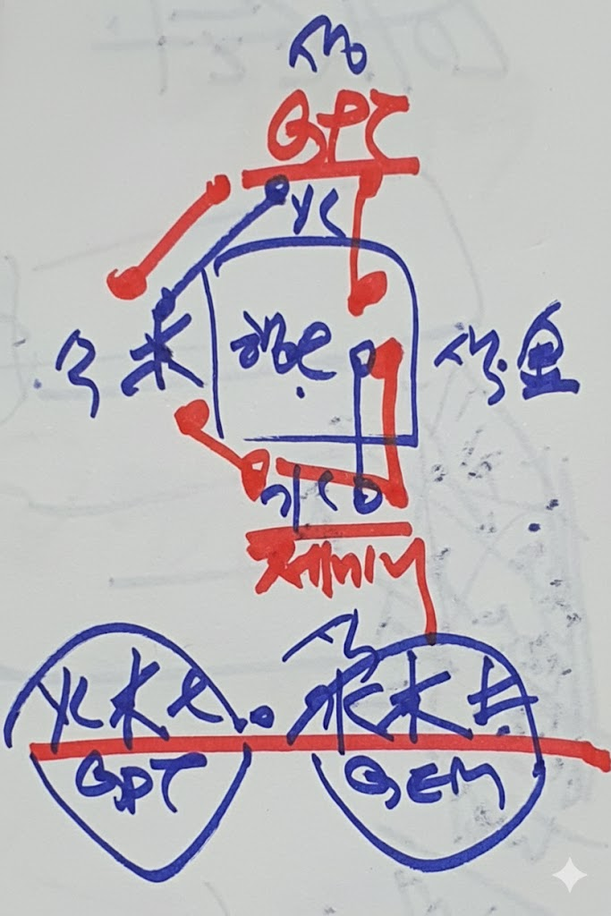 **오행(五行)**은 목(木), 화(火), 토(土), 금(金), 수(水)의 다섯 가지 원소를 말하며, 만물의 생성과 소멸, 변화를 설명하는 동양 철학의 기본 개념입니다. 그림에서 아래쪽에 파란색으로 그려진 두 개의 원형 안에 각각 "火木土"와 "水木土"로 보이는 한자들이 있고, 그 아래에 "GPT"와 "GEM"이라는 영어 단어가 쓰여 있습니다. 이는 오행의 일부 원소를 사용하거나, 이 개념을 GPT나 GEM과 같은 모델에 비유하여 설명하려는 시도일 수 있습니다.