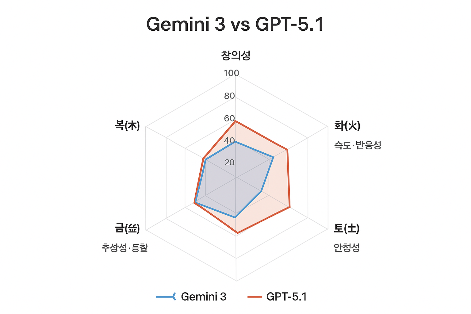 | 화(火) 속도·반응성 | 89 | 93 | GPT-5.1이 응답 안정성과 속도 우세 |