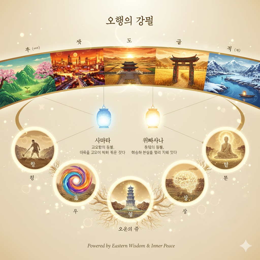 오행의 균형이 무너질 때, 사마타로 마음을 다스려 다시 중심을 잡고, 오온의 번뇌에 갇힐 때, 위빠사나로 그 허상을 꿰뚫어 진정한 평화를 찾으십시오. 이것이 바로 우리가 밝혀야 할 해피인생의 등불이 비추는 길입니다.