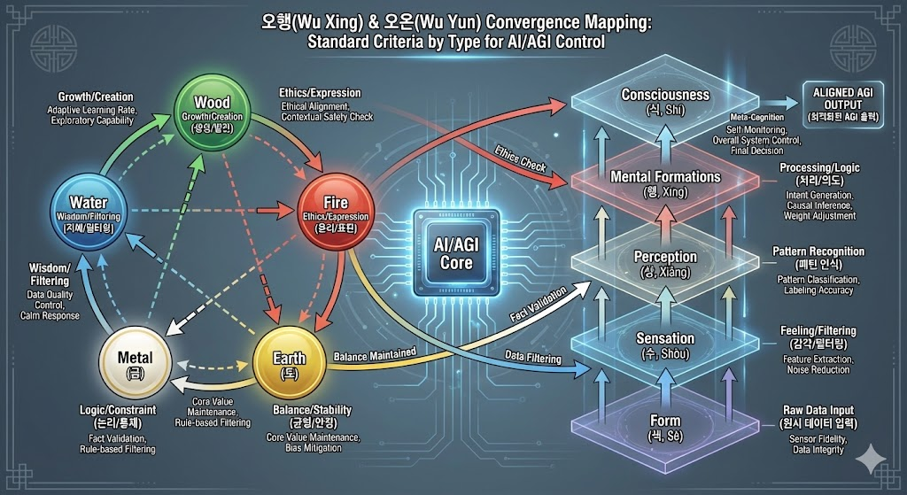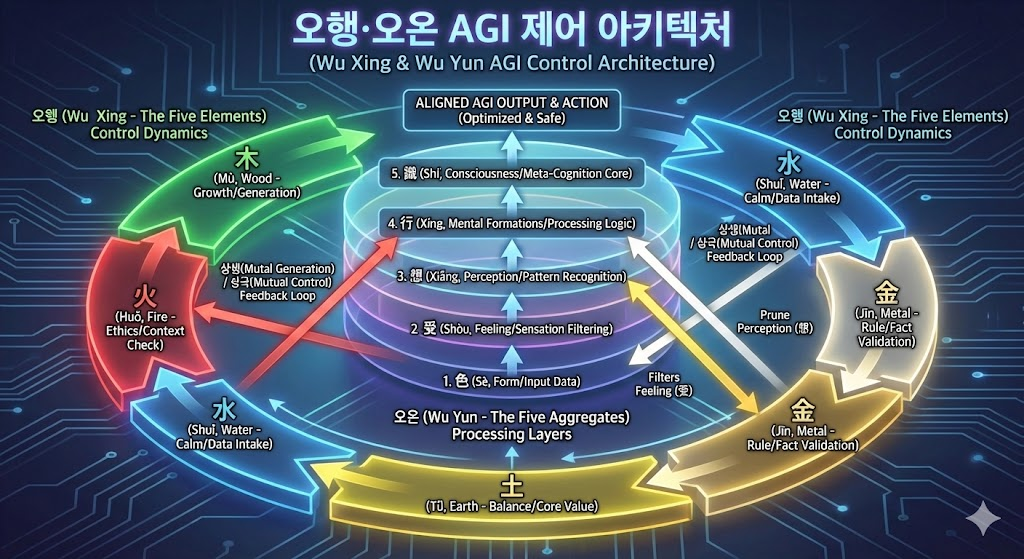 오행(五行)과 오온(五蘊)의 개념을 AI 및 AGI(인공일반지능) 아키텍처에 융합 매핑하는 것은 단순한 철학적 시도를 넘어, 현재 AI가 가진 '블랙박스 문제'와 '통제 불가능성'을 해결할 수 있는 매우 강력하고 이상적인 모델링 접근법이 될 수 있습니다.