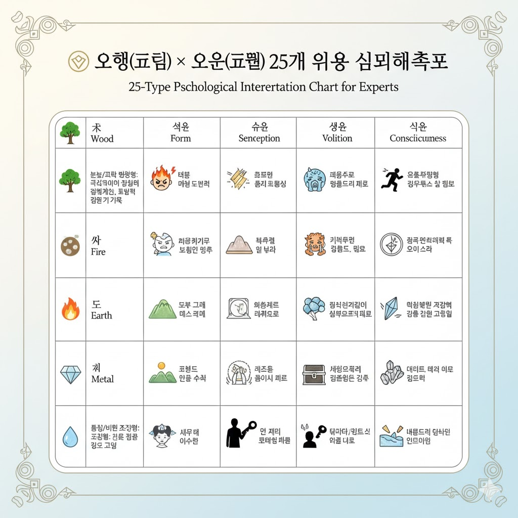 - 오온 심리 반응 진단: 오행 기질 위에서 발생하는 감정, 사고, 습관의 역동성을 파악합니다. (내적 심리)