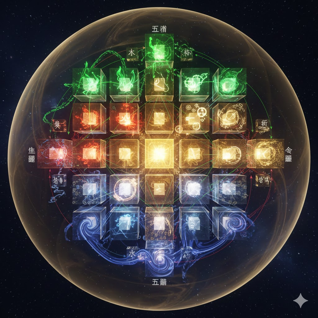 그러나 이들을 단순히 병렬적으로 이해하는 것을 넘어, 오행의 동적(動的) 순환 에너지와 오온의 정적(靜的) 존재 구성 요소를 하나의 입체적인 좌표계로 통합할 때, 우리는 세계와 자아를 해석하는 전례 없는 통찰을 얻게 됩니다.