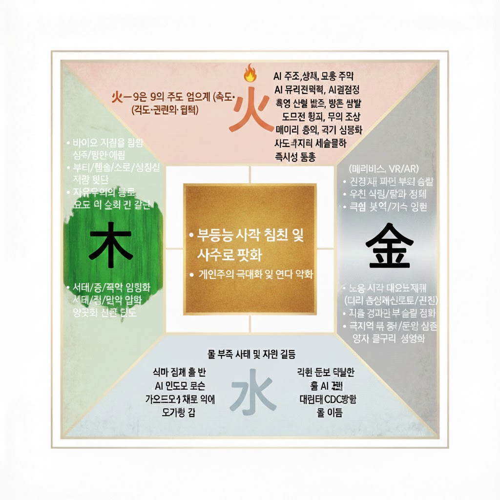 - 火 과잉 → 金 충돌 : 기술·이념 전쟁 격화
