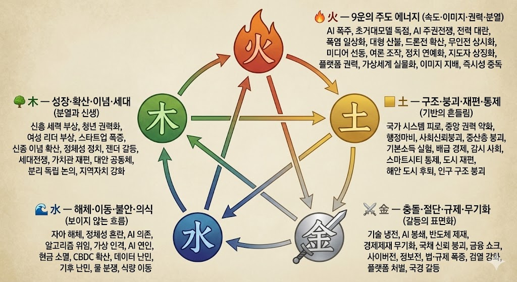 (9운 = 화(火) 주도, 타 오행이 충돌·보완하는 양상)