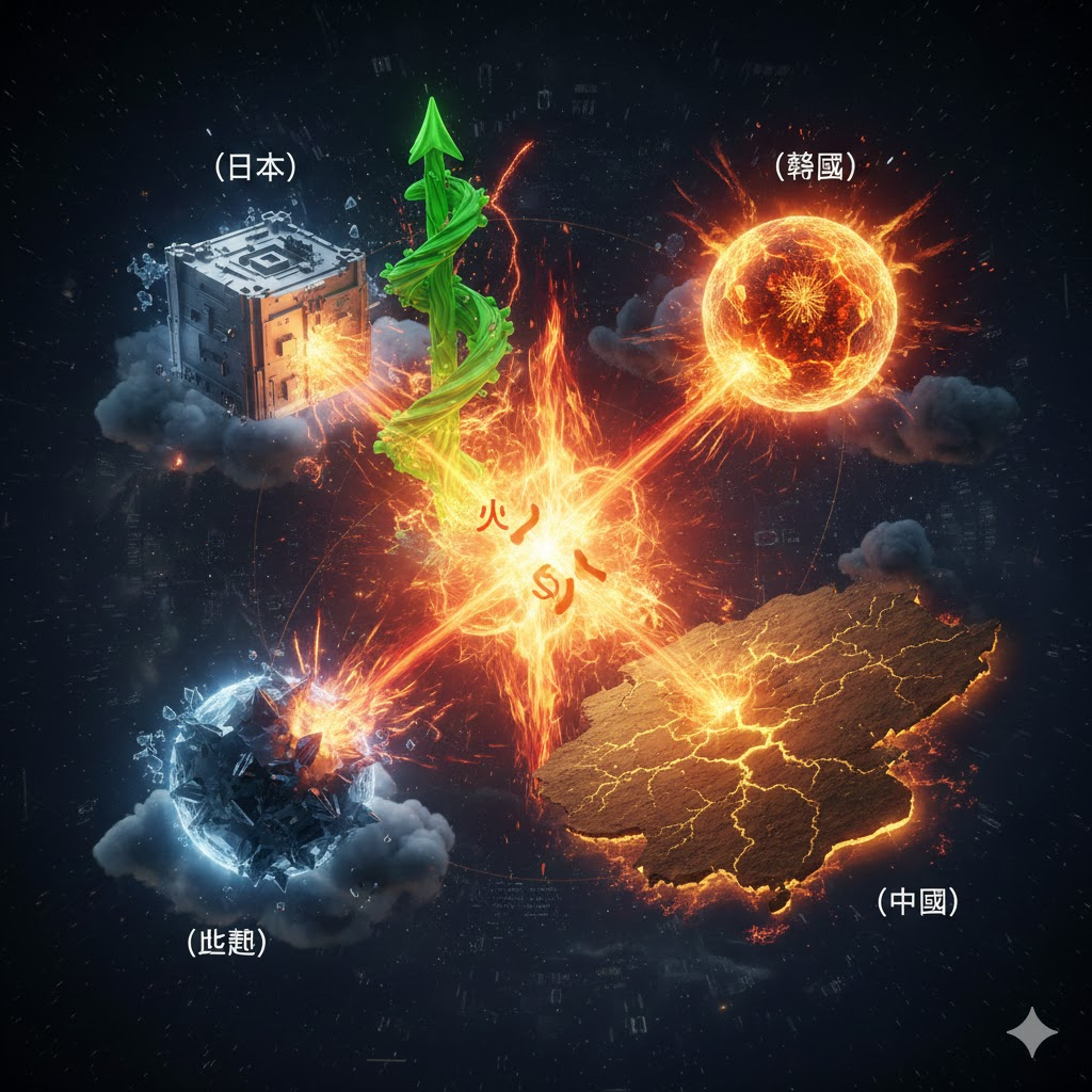 | 중국 | 土 (토) | 상생 (相生, 火生土) | 내실 강화와 불확실성 증대. 불(火)이 타고난 재(土)가 되어 대륙(土)의 토대를 강화하지만, 동시에 화(火)의 급격한 변화와 분리(離) 기운으로 인해 내부 분열, 사회적 불안정의 리스크도 증가합니다. |