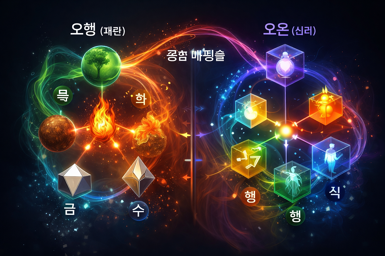 추출된 오행 에너지가 인간의 의식 구조인 **색(신체)·수(감정)·상(생각)·행(의지)·식(판단)**을 어떻게 통과하는지 분석합니다. 똑같은 '재성(財星)' 운이라도 사용자의 '상(想, 인식)'이 오염되어 있으면 결과가 달라짐을 증명하는 핵심 논리입니다.