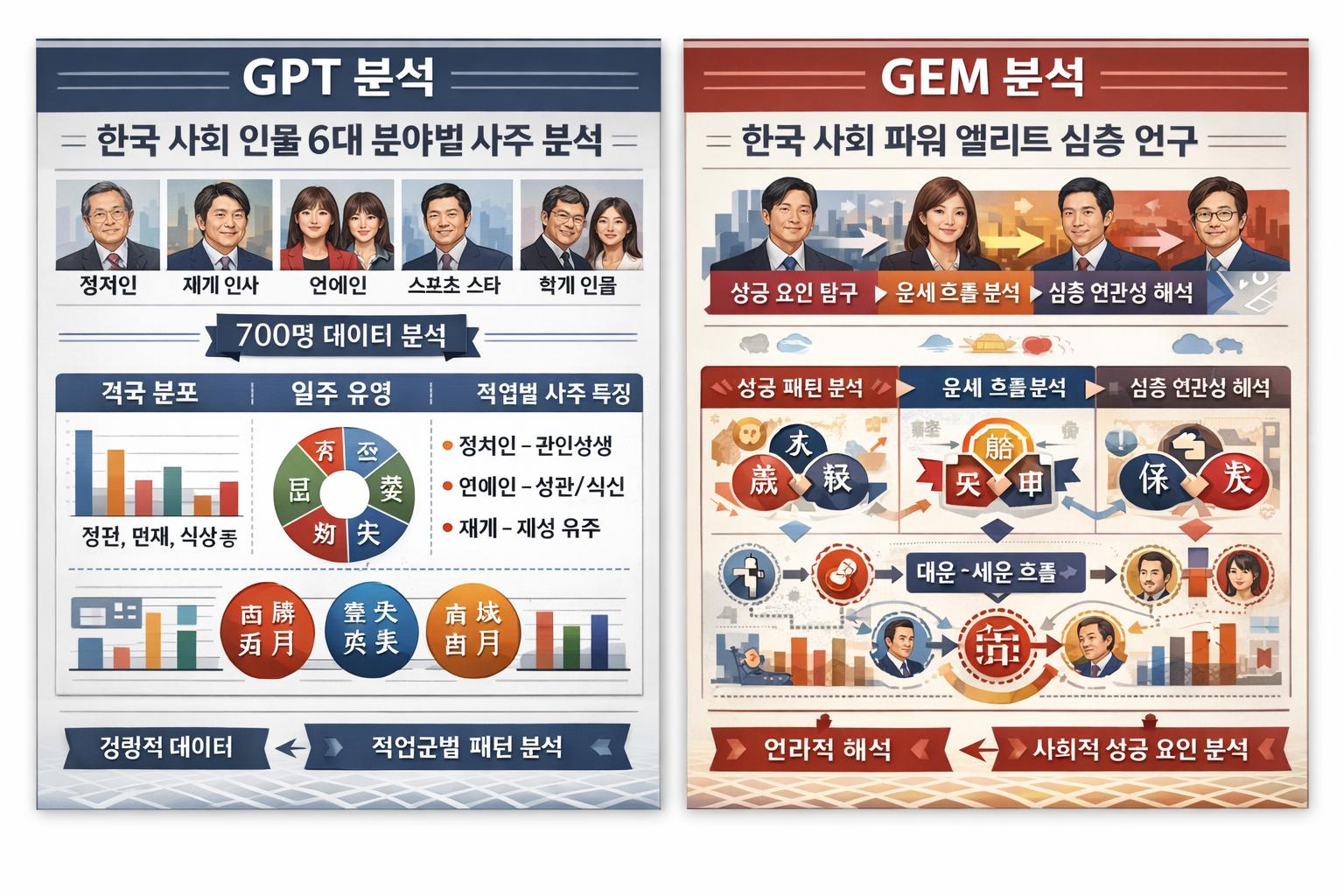 | 핵심 포커스 | 주요 직업군(정치·연예·기업·스포츠 등)별 사주 패턴 분포 | 사주패턴이 사회적 성공 요소와 어떻게 연결되는지 기제 중심 탐색 |