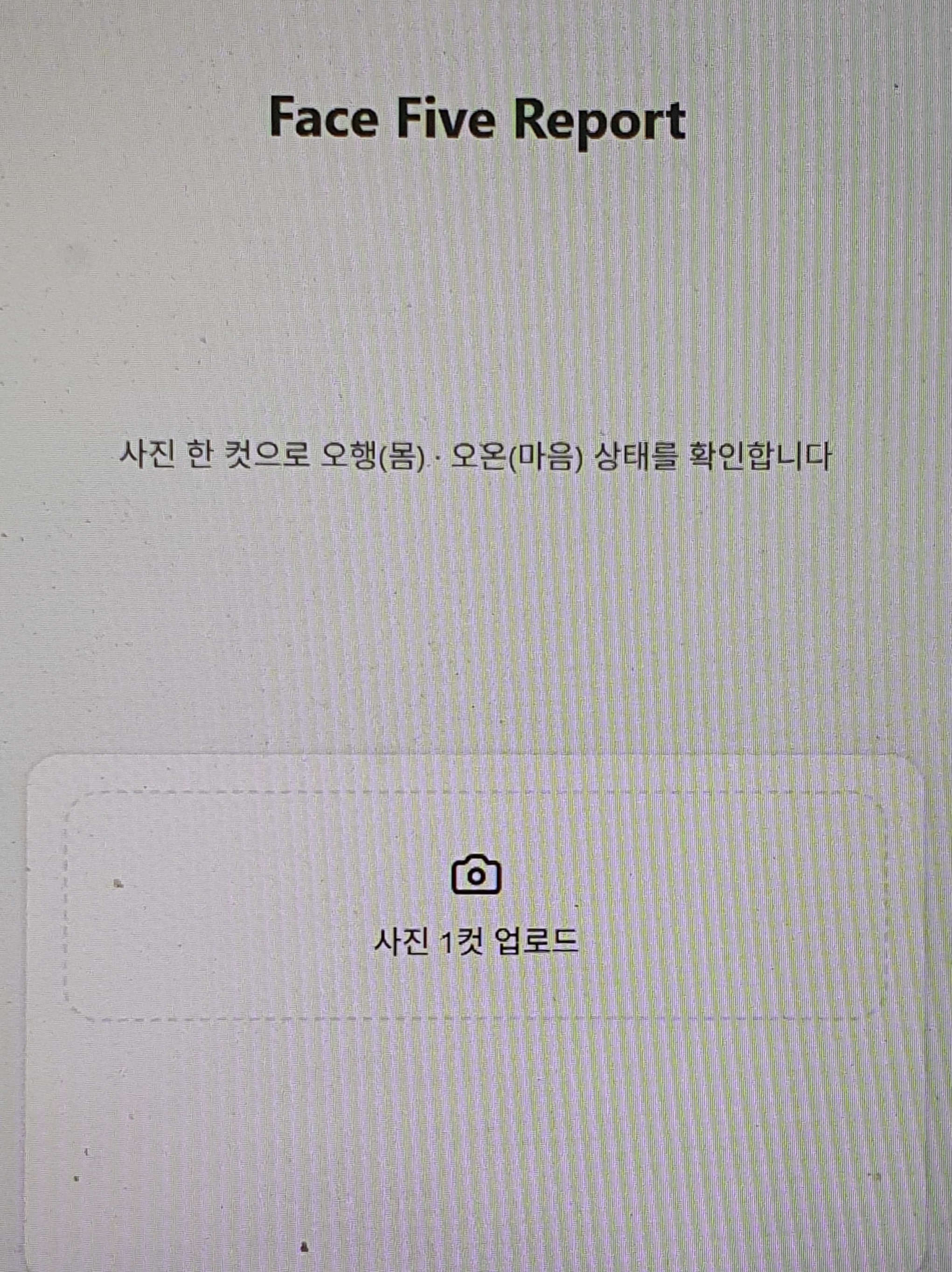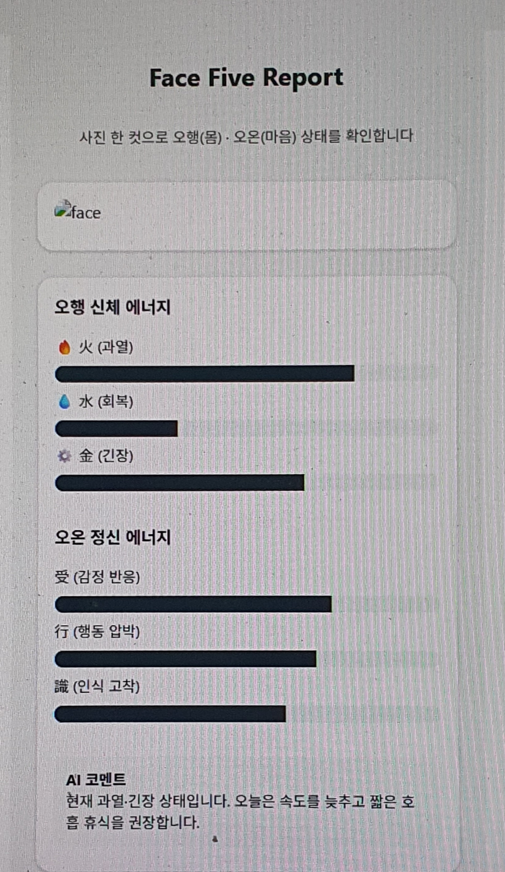 지금 캔버스에 보이는 것이 바로 **“1컷 사진 → Face Five Report → 오행·오온 상태진단”**이 실제로 **작동하는 앱 미리보기(프로토타입)**입니다.
