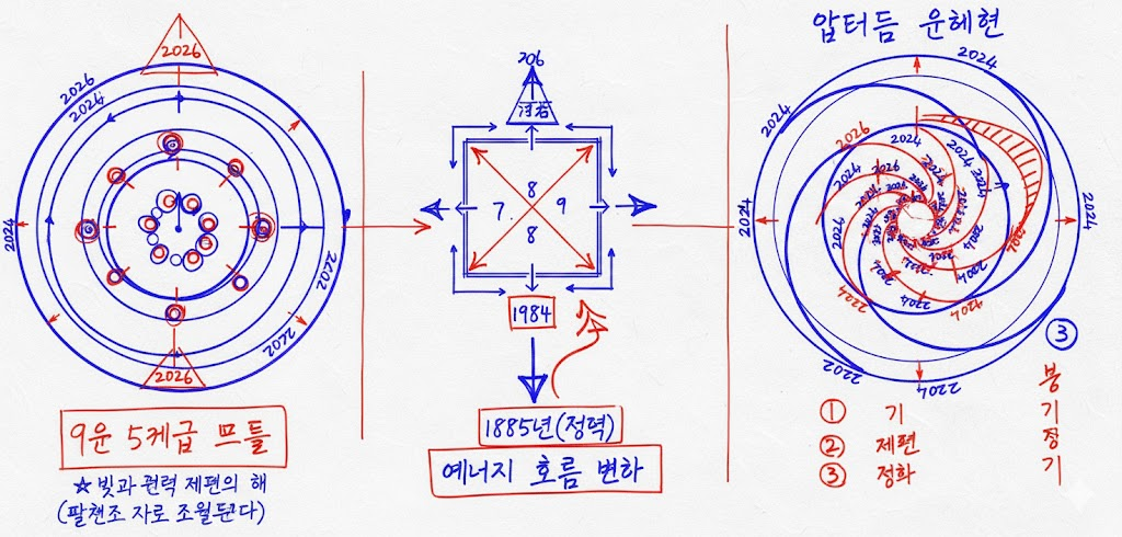 - 순환의 도식: 좌측과 우측의 원형/나선형 다이어그램은 60년 갑자 주기가 어떻게 맞물려 돌아가는지, 그리고 현재의 9운(2024~2043)이 불(火)의 기운을 통해 어떻게 세상을 변동시키는지를 보여줍니다.