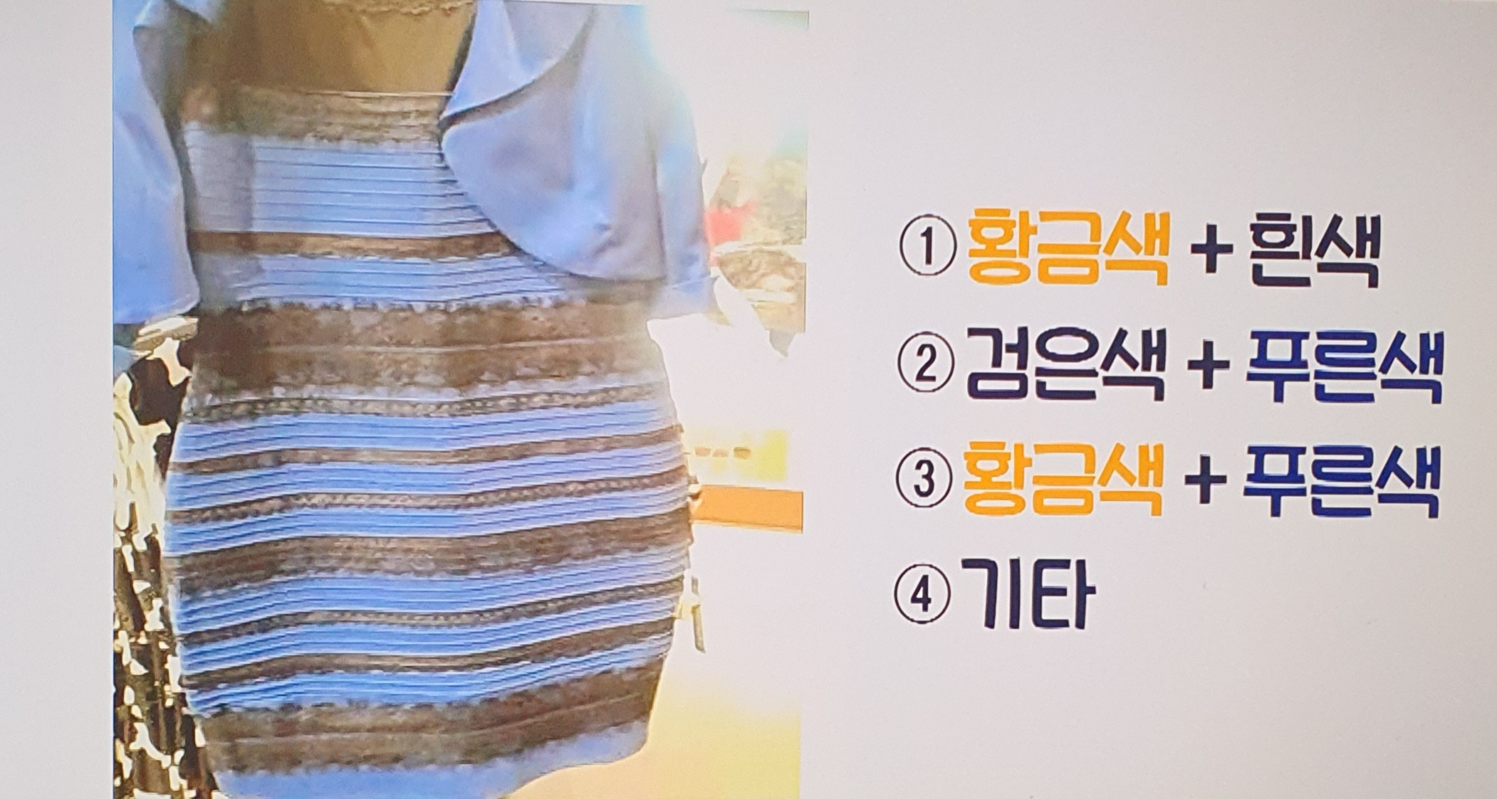 이 사진은 어떤 사람에게는 '흰색+금색'으로, 어떤 사람에게는 '파란색+검은색'으로 보입니다. 이는 불교의 오온(五蘊) 중 **'수(受, 느낌)'**와 **'상(想, 생각/개념)'**이 개개인의 뇌(식, 識)에서 어떻게 다르게 매핑되는지를 극명하게 보여줍니다.