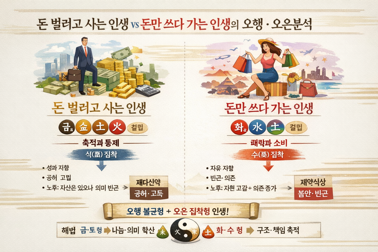 '돈을 벌기 위해 사는 삶'과 '돈을 쓰기 위해 사는 삶'은 동양 철학의 **오행(五行)**과 불교의 오온(五卑) 관점에서 매우 흥미로운 대비를 이룹니다. 이 두 인생의 양식을 에너지의 흐름과 마음의 작용으로 분석해 보겠습니다.