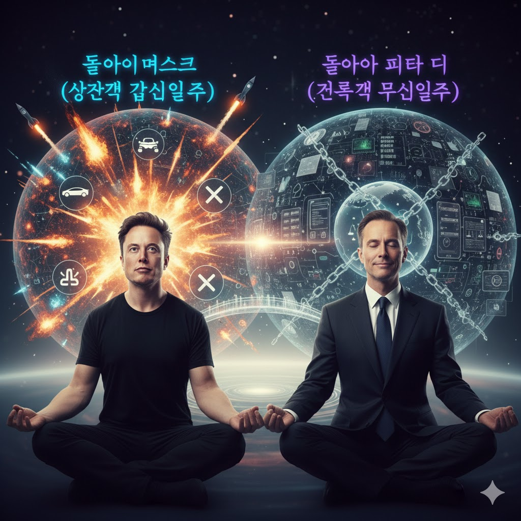 - 메타인지 우위: 머스크가 불꽃놀이를 할 때, 틸은 그 불로 무엇을 구울지 계산합니다. 반대론적 사고가 극에 달해, 남들이 위기라고 할 때 독점적 기회를 포착합니다.