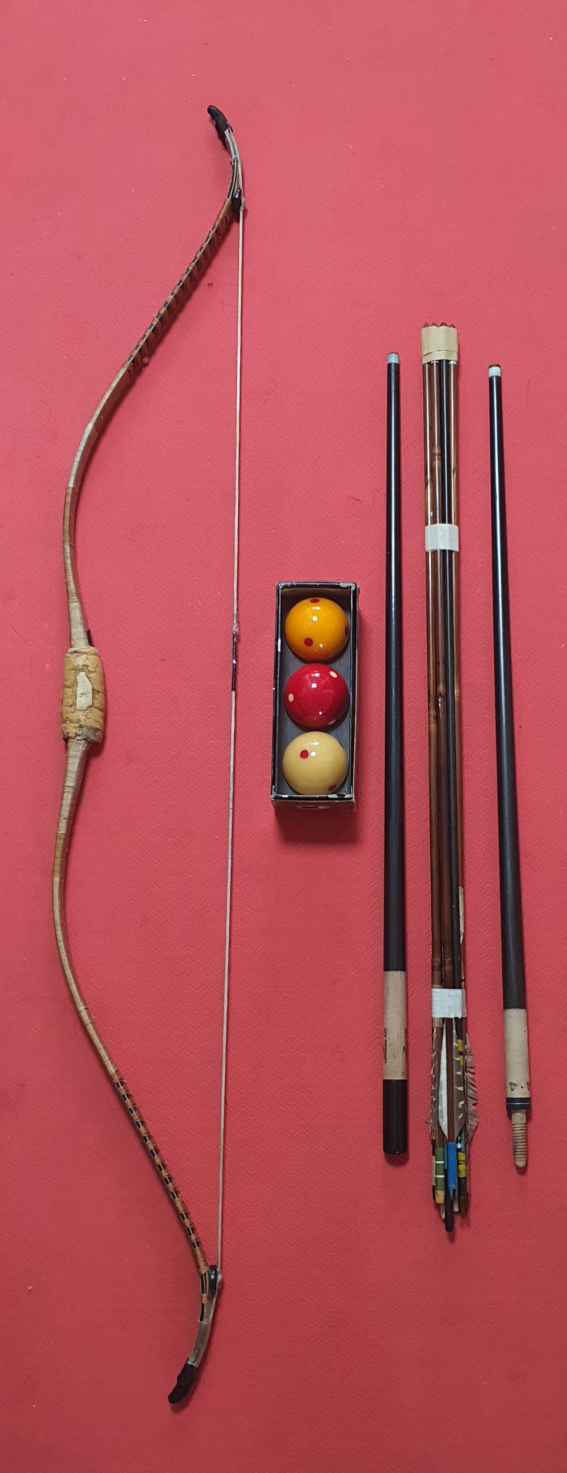 이미지에는 활과 화살, 큐 스틱, 당구공이 놓여 있습니다.
