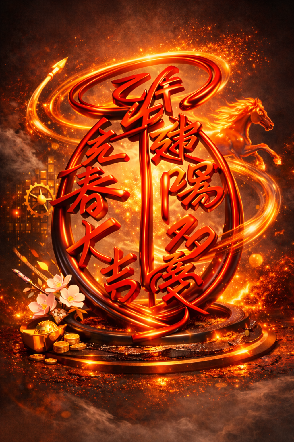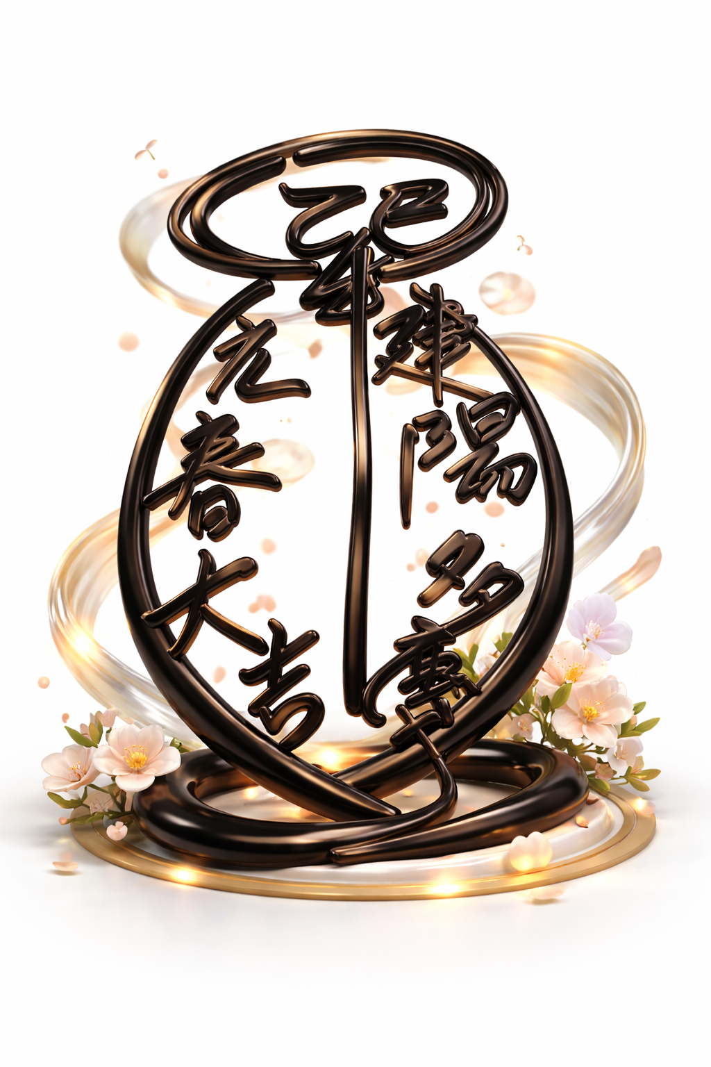 이 3D 추상 이미지는 **「입춘대길(立春大吉) · 건양다경(建陽多慶)」**의 전통적 길상 의미를 현대적·상징적으로 재해석한 구조물이다. 해석을 층위별로 정리한다.