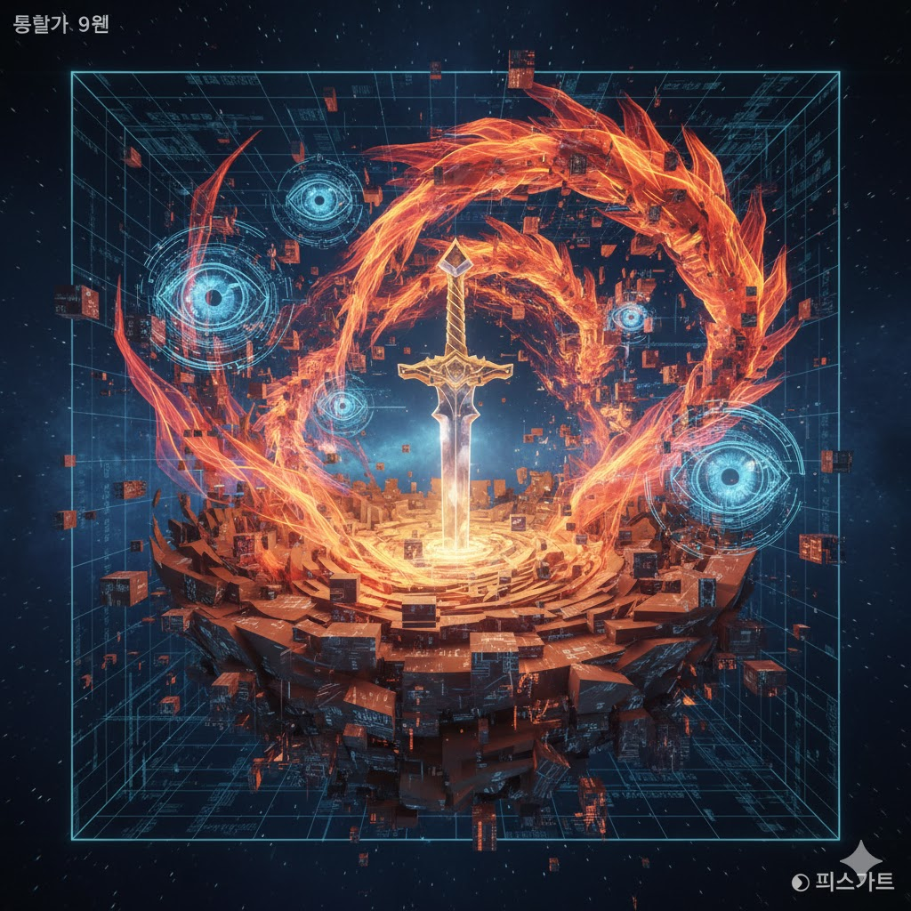 - 키워드: 푸른 묘목의 신경망, 황금빛 정화의 핵, 편인의 기하학적 문양, 3D 추상 설계도.