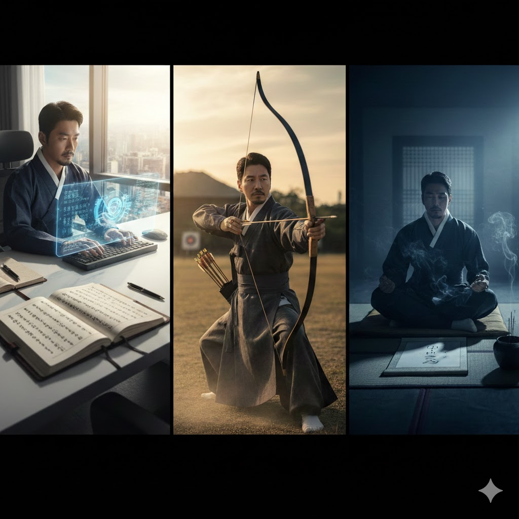 육체(활쏘기), 지성(AI/글쓰기), 정신(수행)의 균형이 완벽합니다.