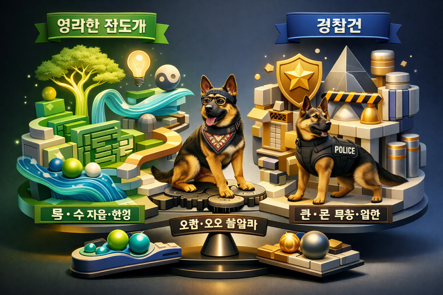 경찰견은 금·토 중심의 단순·일관·복종형, 잔도개는 목·수 중심의 자율·변형·판단형이다.
