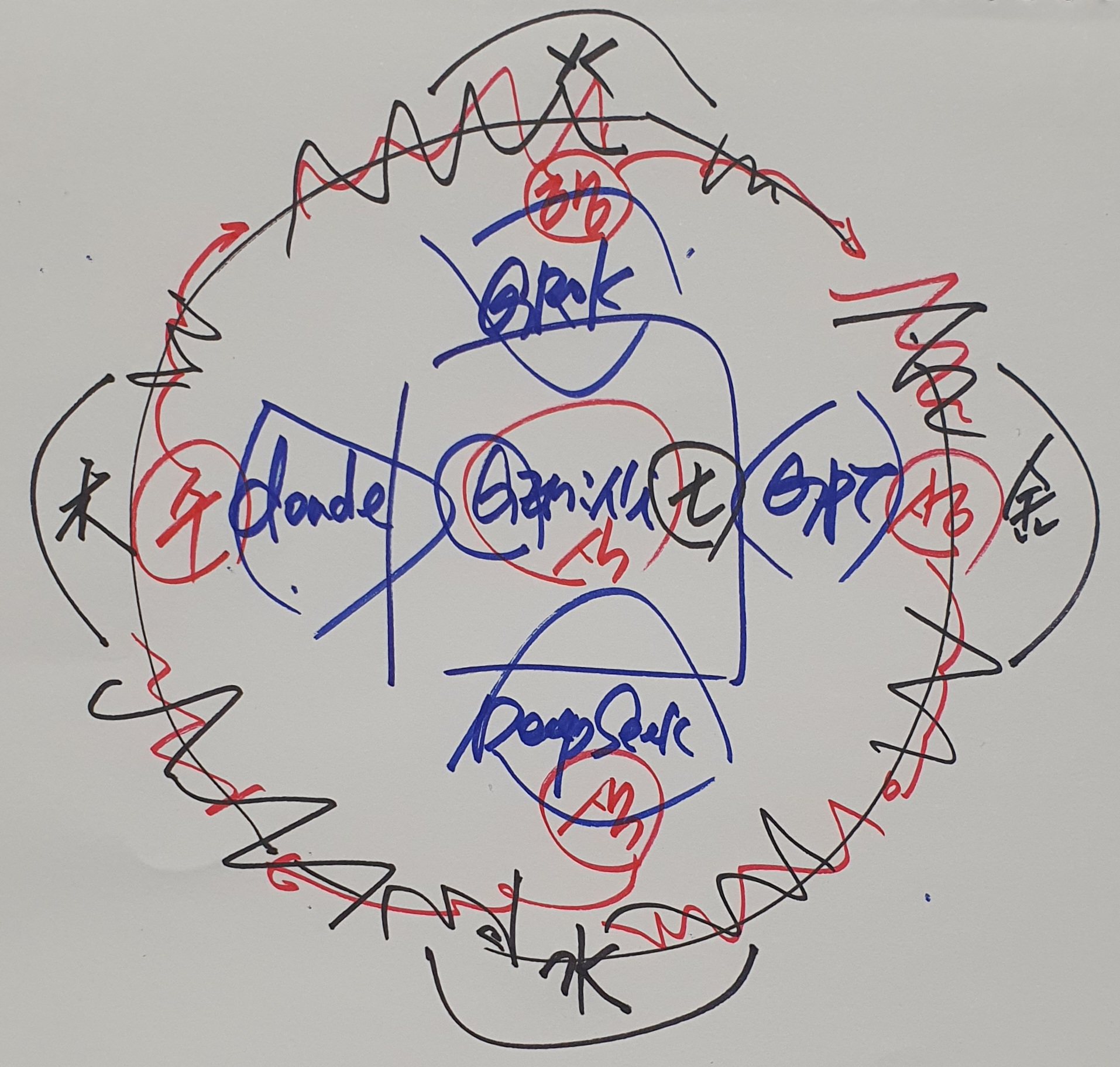 우측 하단에는 DeepSeek가 푸른 물결 구조로 나타난다. 반투명한 파동이 아래로 흐르며, 빛이 내부에서 굴절된다. 이는 수(水)의 흐름·적응·연산 효율을 의미한다. 물결이 원형 궤도와 맞닿으며 부드럽게 순환 구조에 편입되는 모습은 저비용·경량화 확산 전략을 상징한다.