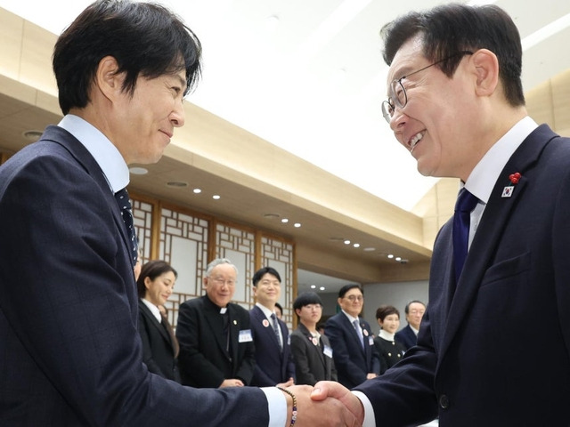 이재명 대통령이 16일 용산 대통령실에서 열린 성금 전달 행사에서 배우 최수종과 만났다. 특히 이 대통령과 최수종의 만남 사진이 공개된 뒤 온라인 커뮤니티 등에서는 둘 사이의 나이차가 화