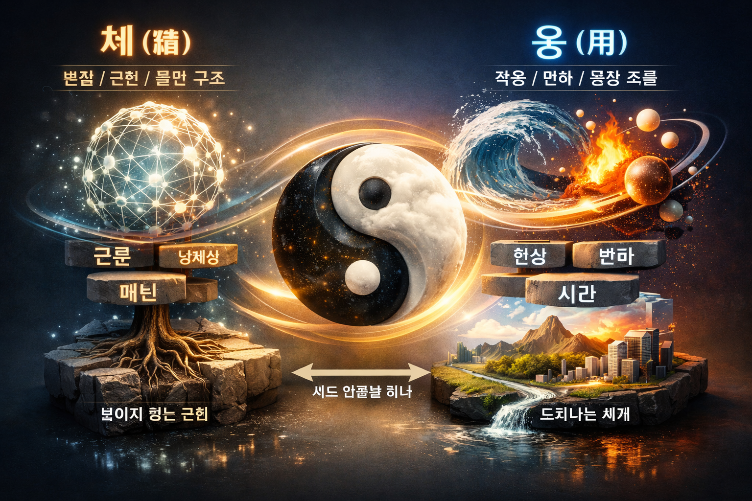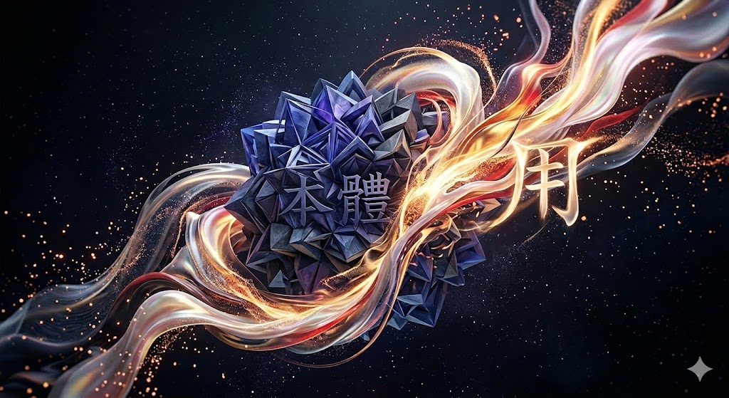 이미지를 보시면 중앙의 단단하고 기하학적인 결정체는 만물의 본질인 '체(體)'를, 그 주위를 역동적으로 휘감으며 흐르는 빛의 에너지는 본질의 작용인 '용(用)'을 시각화하고 있습니다.