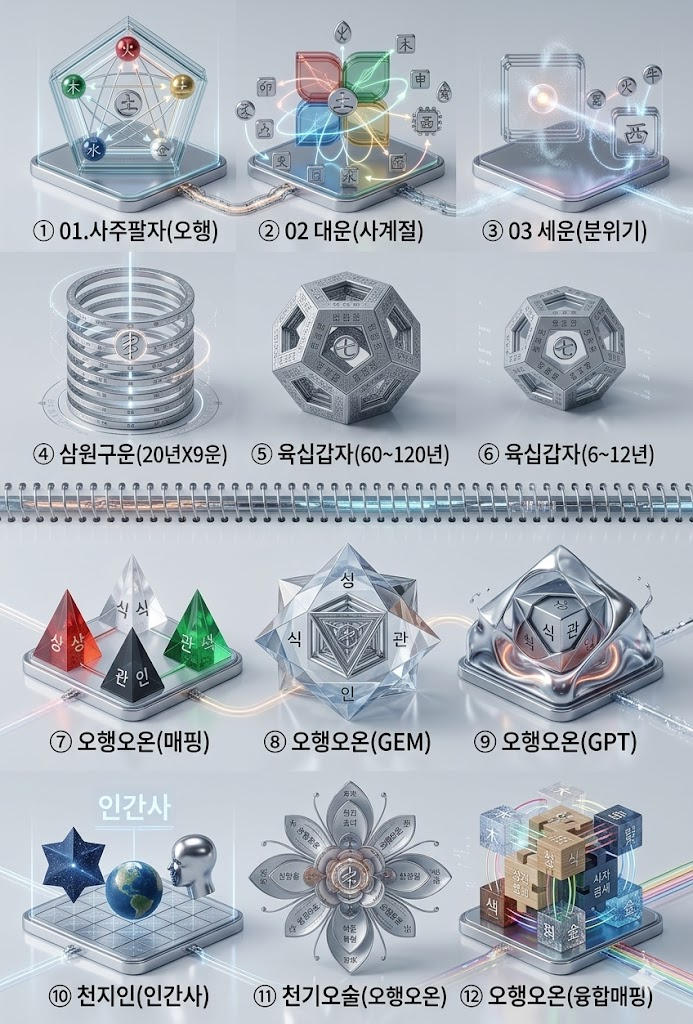 이 네 가지 축이 결합되면, 단순한 운세 해석이 아니라 **“동적 예측 모델”**이 된다.