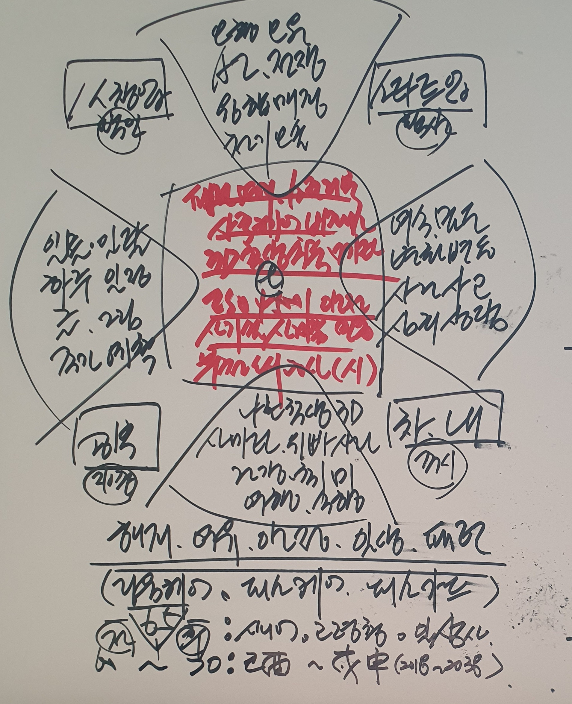 화이트보드에 정성스럽게 그려진 이 도식은 단순한 메모를 넘어, **AI 기술과 동양 철학, 그리고 개인의 삶과 비즈니스를 하나로 통합하려는 거대한 '개념 설계도'**로 보입니다.